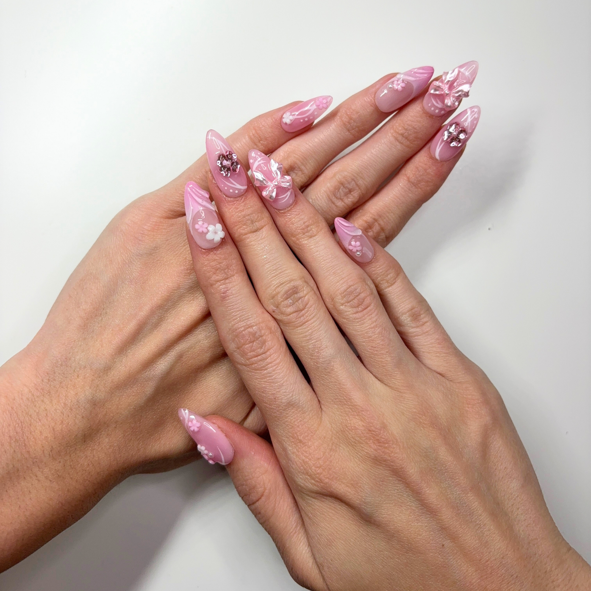 Blossom Bloom je set, ktorý oslavuje nehu, ženskosť a lásku v každom detaile. Kombinuje 3D kvietky, drobné srdiečka a hravé 3D vlnky, ktoré dodávajú dizajnu pohyb a hĺbku.