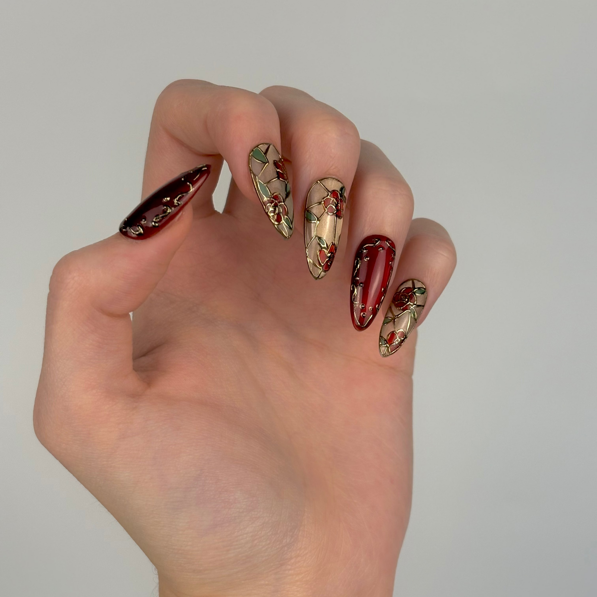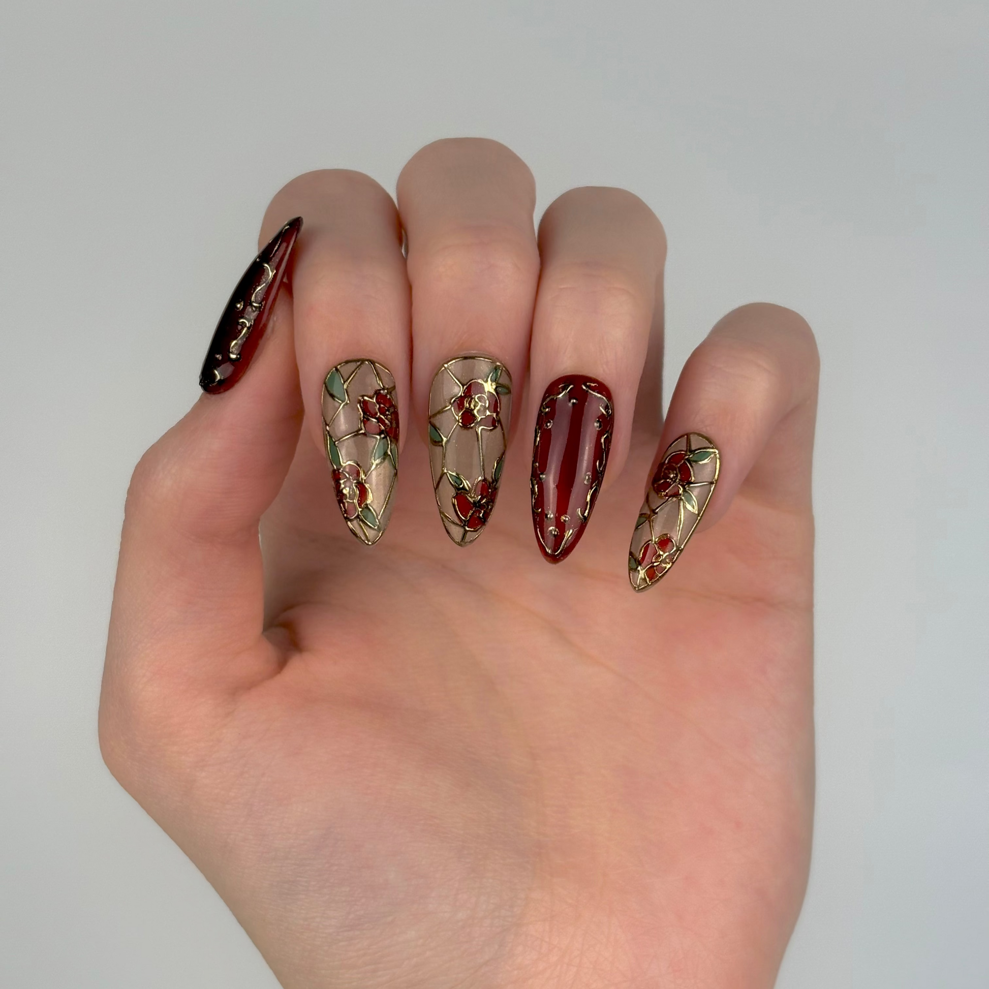 Gloria spája červený a zlatý magnetický gél lak s detailnými 3D ružami v zlatom obryse, ktoré napodobňujú vitráže starobylých chrámov.
