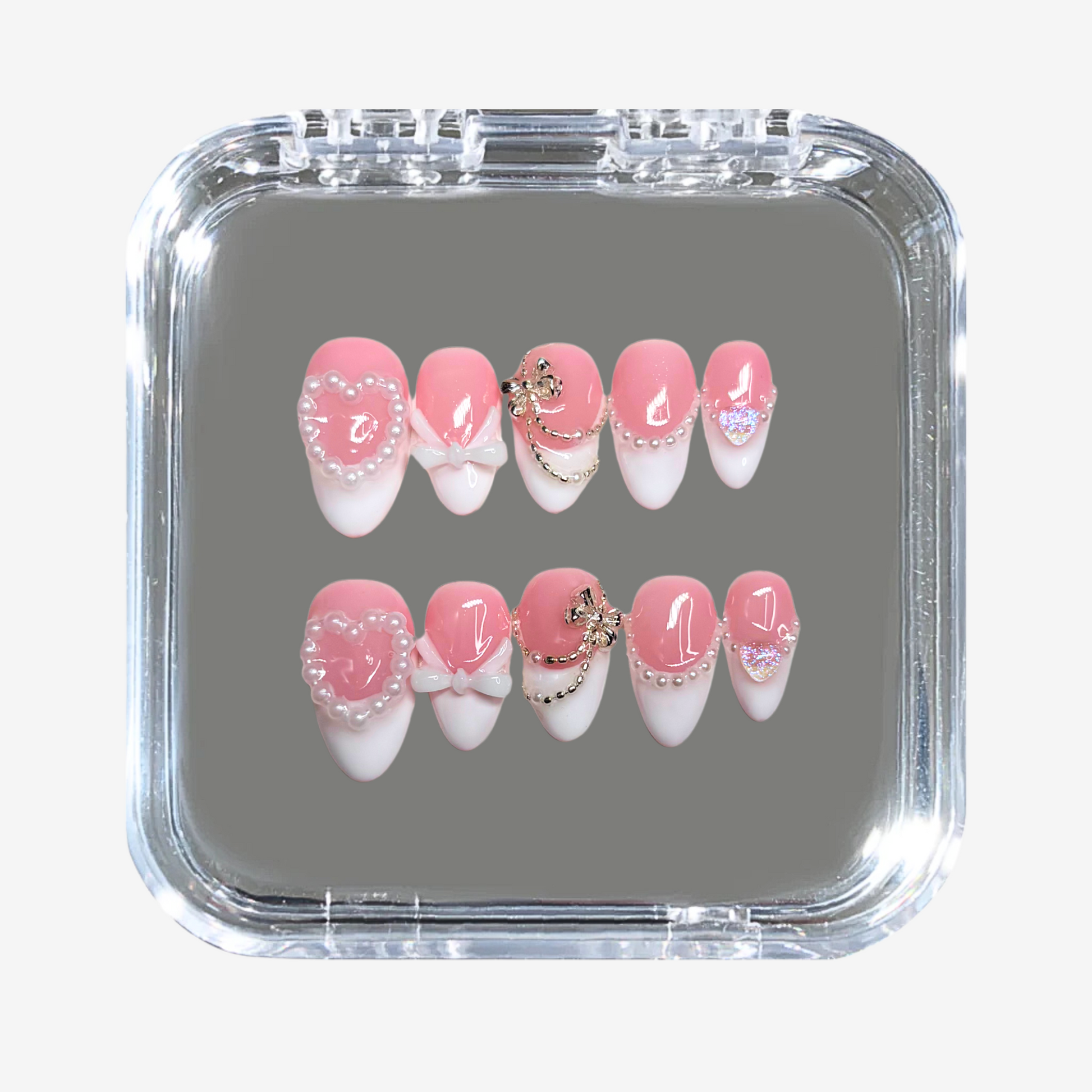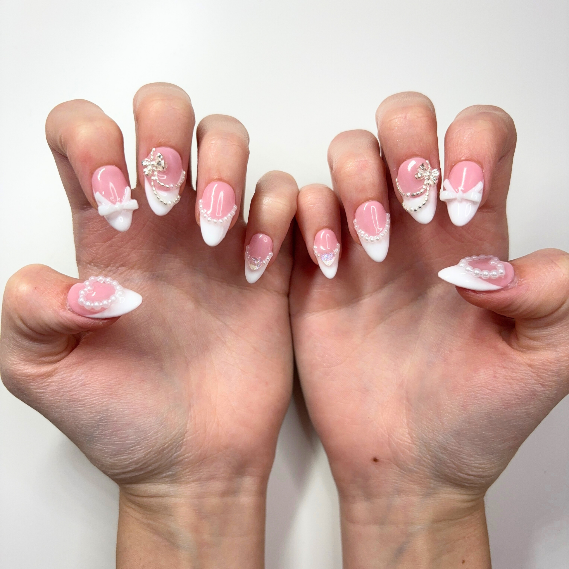 Kombinuje bielu francúzsku manikúru s perlovým zdobením, drobnými mašličkami a luxusnými šperkovými akcentmi. Tento dizajn pôsobí nadčasovo, sofistikovane a je ideálny pre špeciálne príležitosti, keď chceš pôsobiť výnimočne.